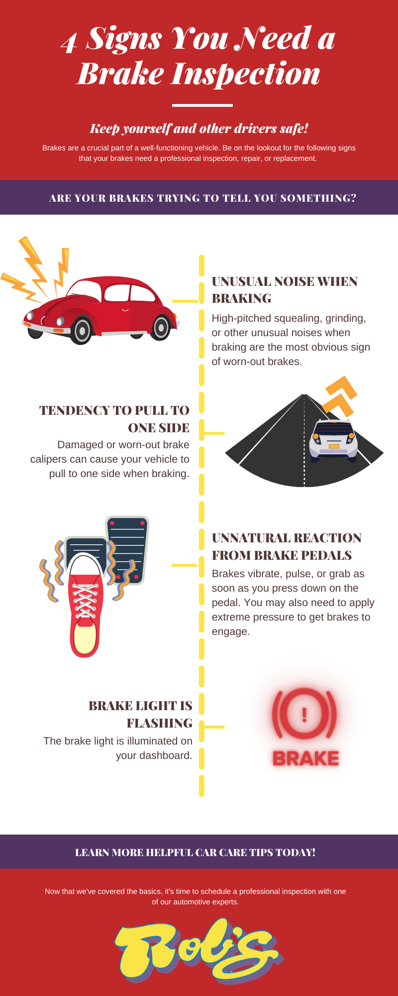 Besides taking these precautions, if you notice any issues with your brakes, it is best to schedule an inspection. Doing so can lengthen how long your brakes last, for maintenance is key. Take a look at some of the main signs of brake issues in the infographic below.