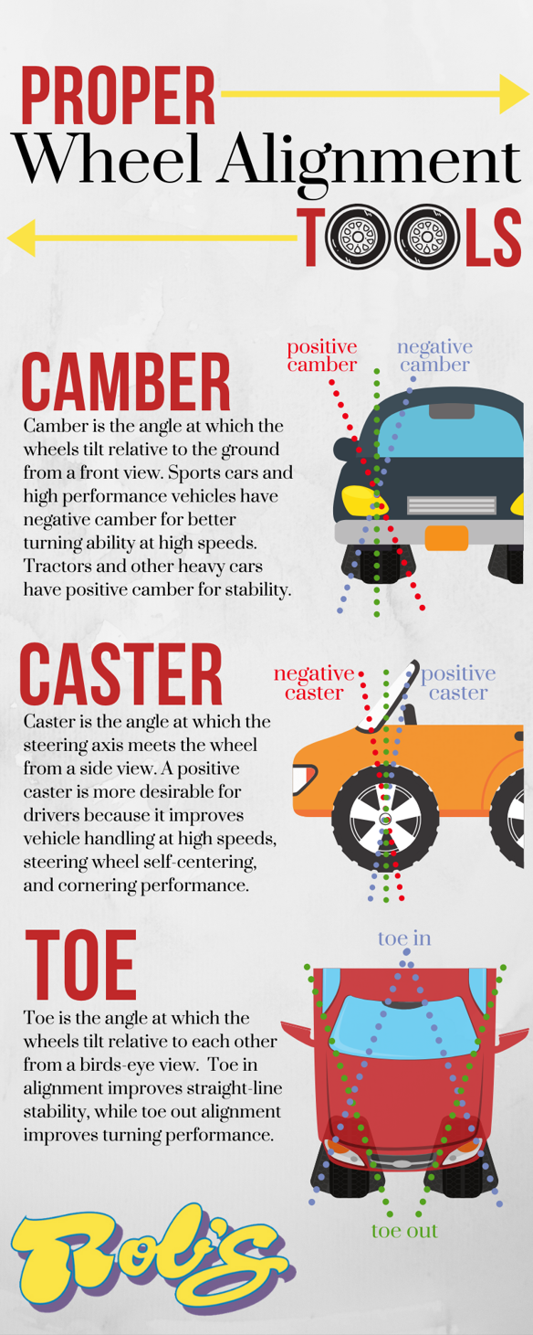 Wheel alignment is imperative to the lifespan of your tires because it has a significant impact on their performance. Learn more about the three aspects of wheel alignment from our infographic below.